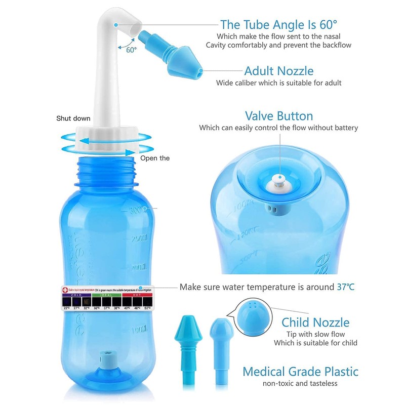 Nasal Rinse Is Easier To Clean.Are you suffering from a cold? After you use this nasal irrigation for 2 or 3 days you will become a believer of just washing that gunk out rather than loading up on medicine.The nasal cleaner can hold up well in the dishwasher without melting or deforming the plastic. But we recommend hand wash,it's more hygienic. This neti wash features wide mouth makes it easy to prepare the saline solution.The angled nozzle is an added benefit. You don't need to tilt your head as much as you do with the alternative nose wash bottle.Warm TipsThe sinus rinse bottle is perfect for kids who are above twelve years of age. Otherwise, you should consult your child's physician before use.Please do not rinse with plain water which will result in a severe burning sensation.If you have had ear surgery, please contact your physician prior to irrigation.Do not use hot or boiling water.WARNING: DO NOT RINSE IF NASAL PASSAGE IS COMPLETELY BLOCKED.How To UseStep 1: Wash your hands before start. Fill the nasal irrigation up to the fill line with lukewarm distilled water or previously boiled water.Step 2: Add a packet of nasal wash salt pour into the water. Tighten the cap & tube on the travel neti pot. Shake the nose cleaner gently to dissolve the mixture.Step 3: Standing in front of a sink, bend forward to your comfort level and tilt your head down. Keep your mouth open and do not hold breath. place cap snugly against your right nostril and press the button on the bottom until the solution starts draining from the other nostril or mouth.Step 4: Repeat steps 3 for your left nostril.Package Included1*500ml Sinus Rinse Bottle1* Paper Thermometer1 *Adult Adaptor1 *Kid Adaptor1*User manualTips:NO salt packet!