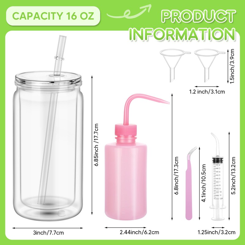 - 【16 OZ CLEAR DOUBLE WALL PLASTIC SNOW GLOBE TUMBLER KIT】: A set of 8 transparent snowflake cups with BPA free clear lids and straw , 1 curved spout sprayer, 2 small funnels, 1 curved spout syringe, 24 silicone plug and 1 small tweezer.