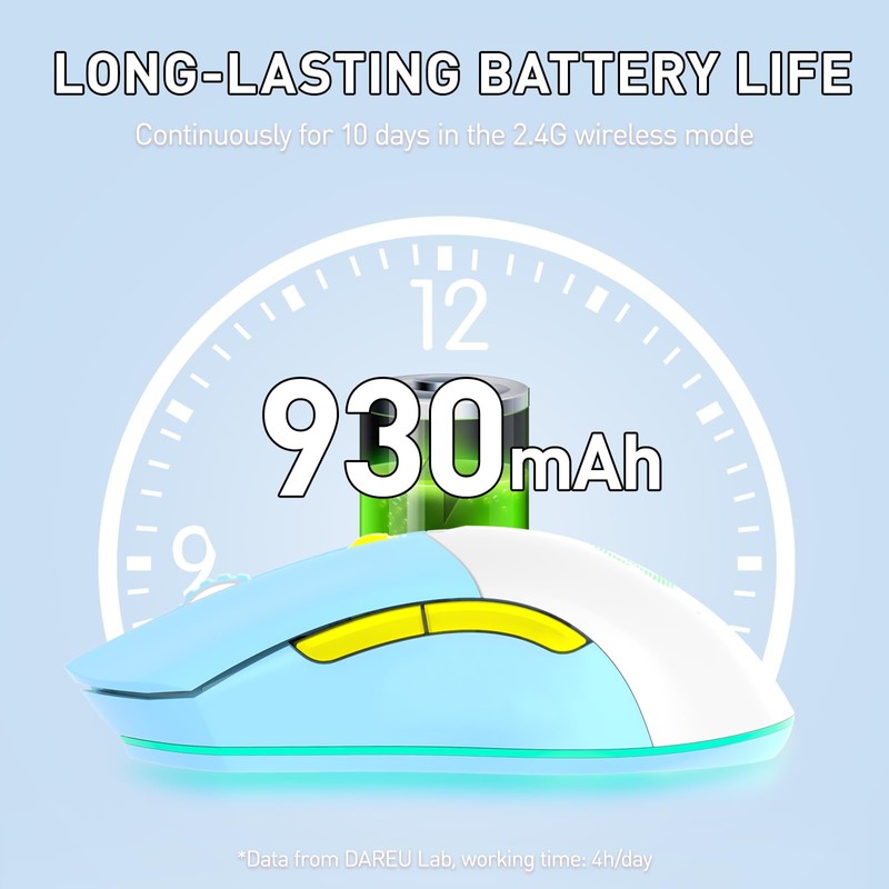 - 【Ultra Long Battery Life】In-built 930mAh lithium battery allows continuous 10 days of working time in 2.4G working mode,TYPE-C-to-computer connect provides charging function,with mouse keeps working at the same time. (Data from DAREU Lab, working time: 4h per day)