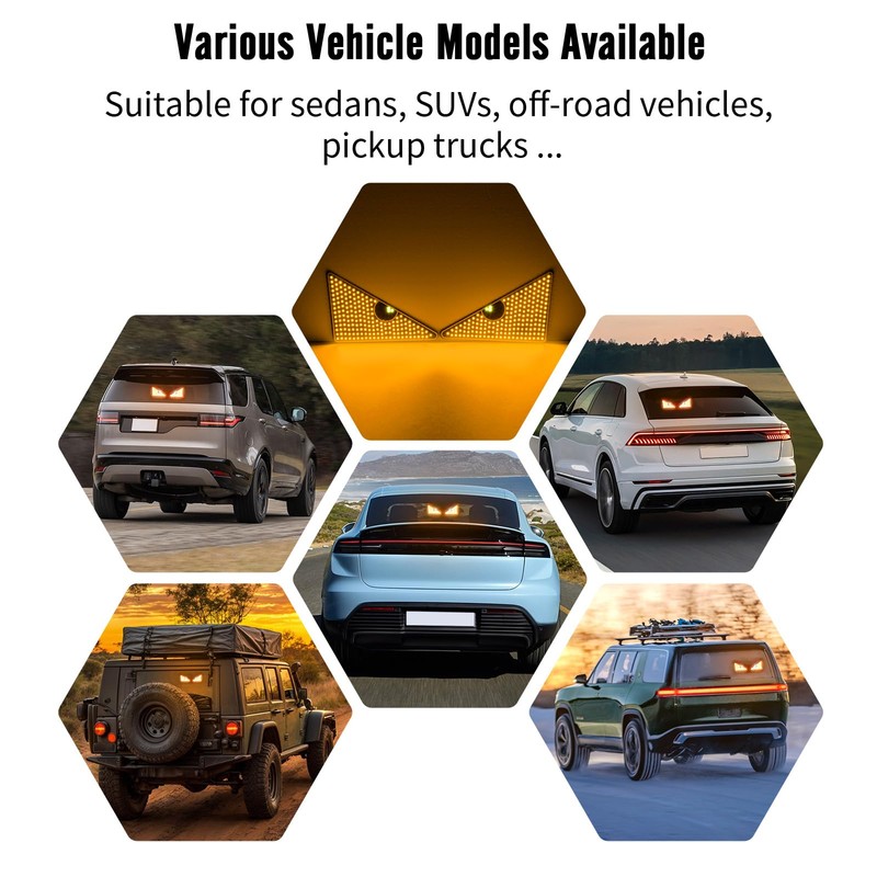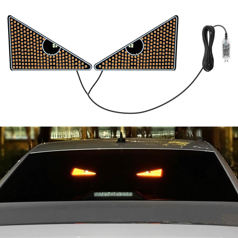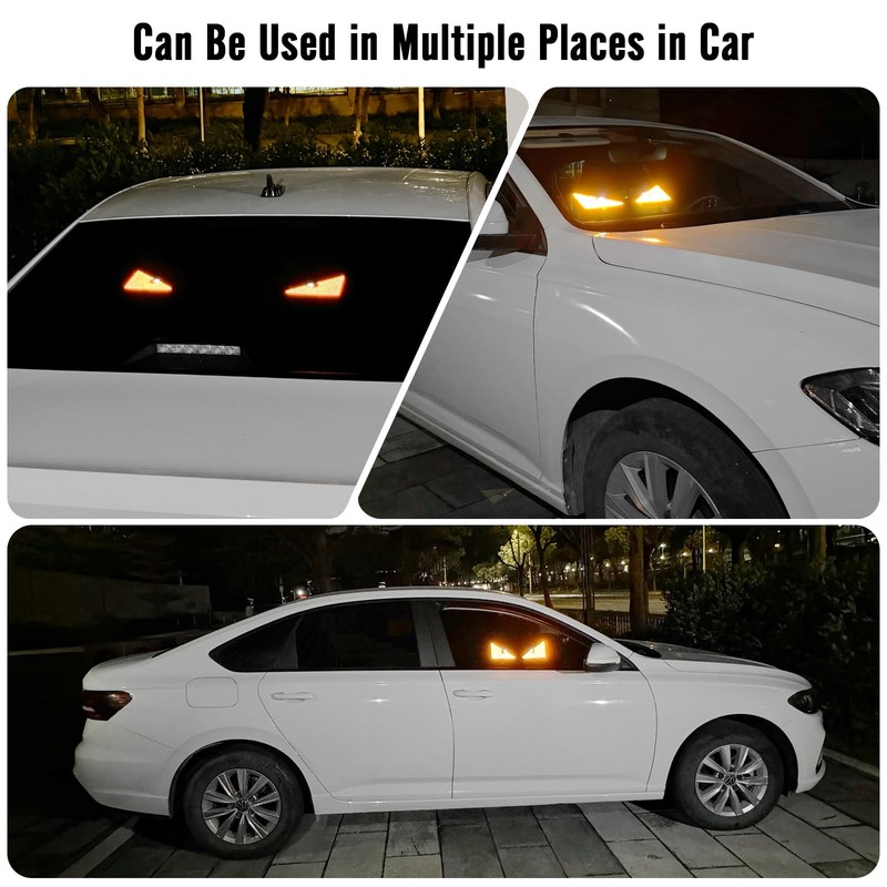 - LED Eyes for Car: Dargoose devil eyes light for cars is funny and safe. Yellow triangle eyes add a cool and style appearance to car, also used for attracting other drivers' attention, to remind the following car not to follow closely and prevent rear-end collision.