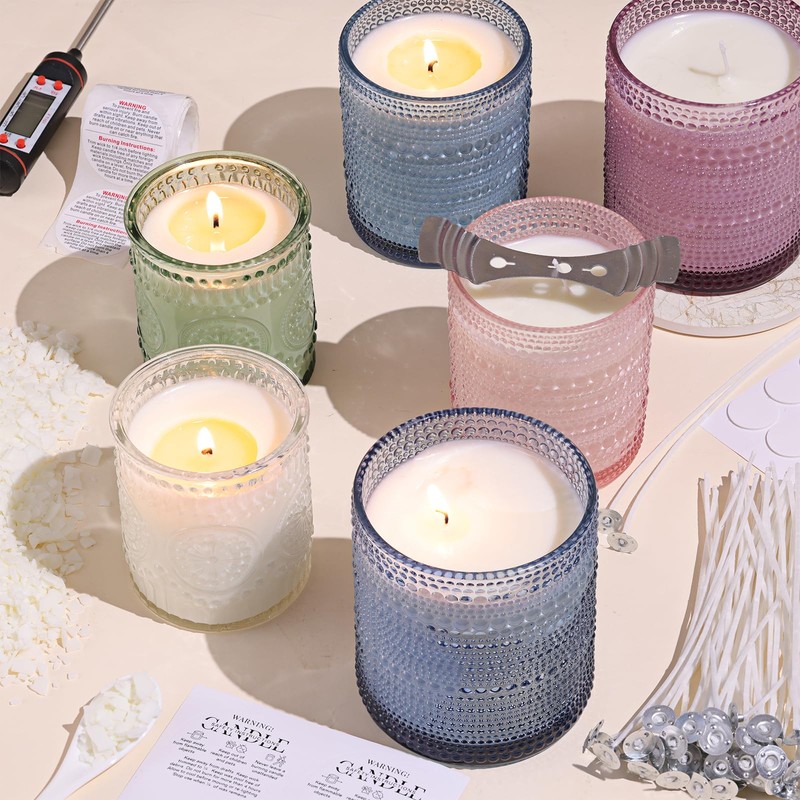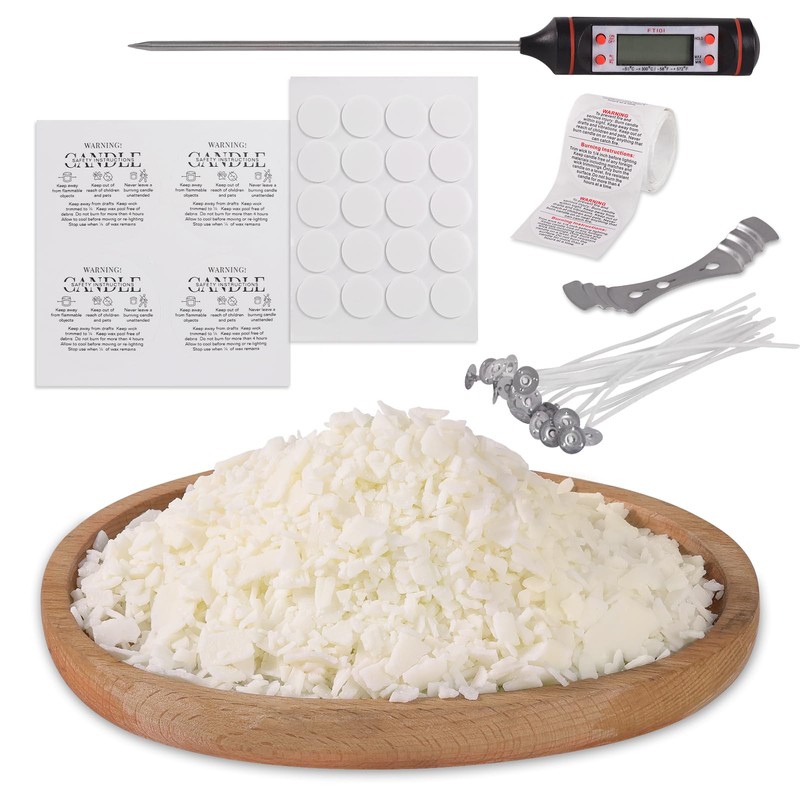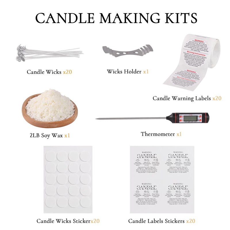 - Candle Making Kit: you will get 2LB soy wax for candle making, 2 metal wicks holder, 1 thermometer, 20 cotton candle wicks, 20 candle wicks sticker, 20 candle labels stickers and 20 candle warning labels. DARJEN DIY candle making kit supplies are great for beginners