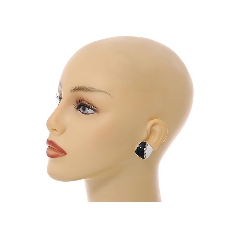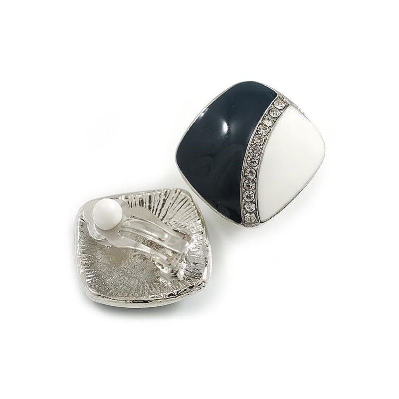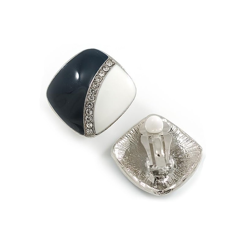 Dark Blue/White Enamel Crystal Square Clip On Earrings In Silver Plating - 20mm Tall