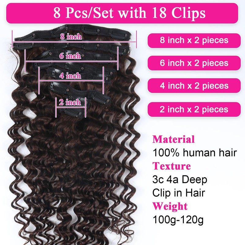 Dark Brown Clip-In Real Human Hair Extensions, 24 Inches, 60 cm, 120 g, 8 Pieces, #2 Brown Real Hair Extensions, Soft, Deep Wavy Curly Clip-In Extensions Made of Remy Real Hair for Women