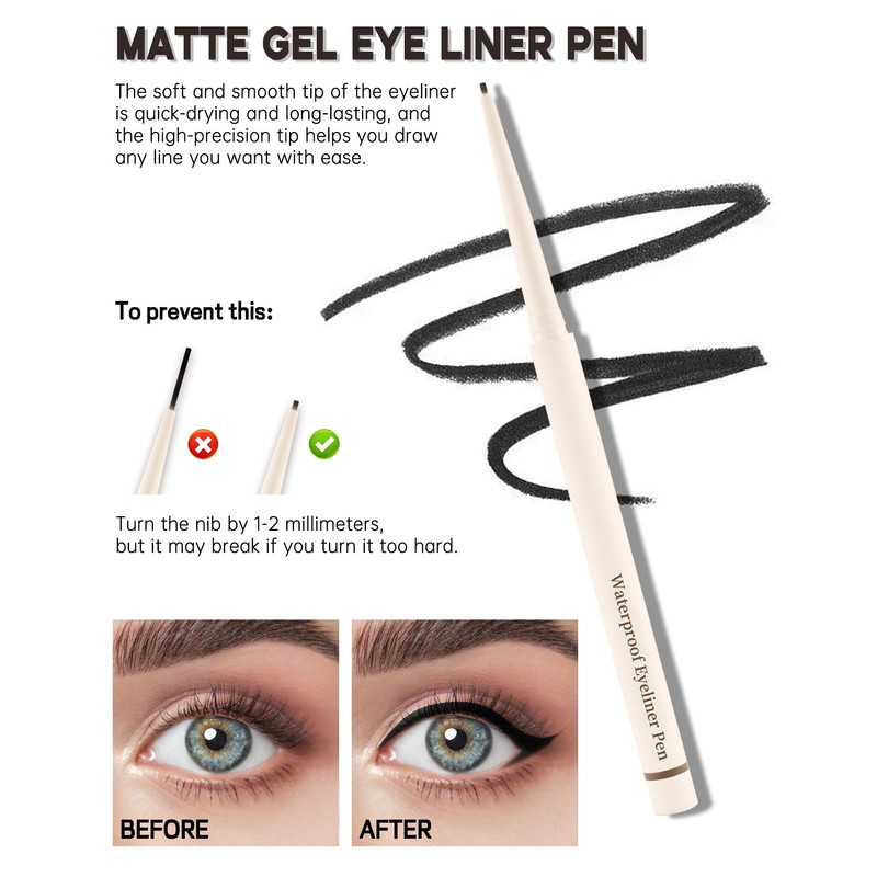 - Matte Eyeliner Gel Pencil - Available in 5 different classic colors, our gel eyeliners provide a natural, long-lasting color effect. This eyeliner pen has an ultra-fine tip for a more defined and layered look. A highly pigmented formula for an intense color that is sure to pop with the rest of your makeup or when used on its own