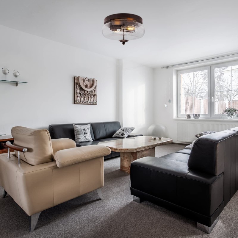 - FARMHOUSE STYLE DESIGN - This semi flush mount ceiling light with a round seeded glass lampshade, in oil bronze finish. with 2-light sockets, a simple but artistic look. Glass provides ample light projection and revealing exposed bulbs. Easier to replace bulbs and clean.