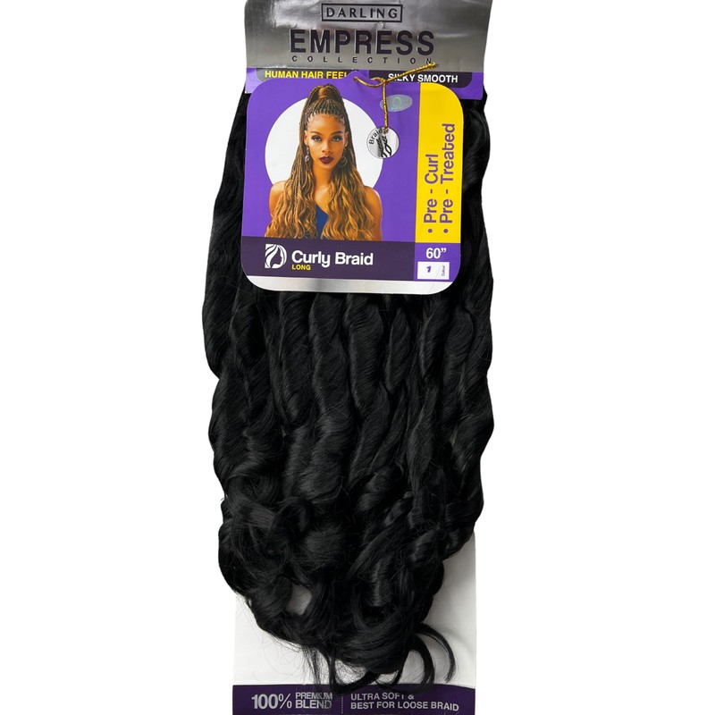 - * A variety of braiding hairstyles can be created using these extentions * Several stylish and flattering hair styles can be created because of the the light weight texture * Maintenance of the hair is simple and straight forward * Add an elegant touch to your hair, Darling Empress Culry Braids are human like with lustre and texture of natural hair * Achieve styles like Knotless box, diamond, and triangle braids effortlessly with our pre-curled, lightweight, and silky smooth Darling Empress Curly Braid. * Available in a variety of colours