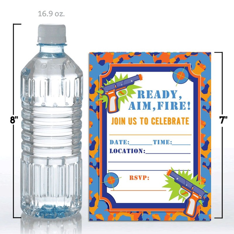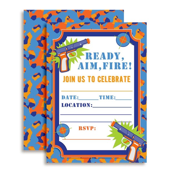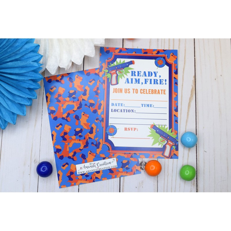 Dart Gun Birthday Party Invitations, 20 5"x7" Fill In Cards with Twenty White Envelopes by AmandaCreation