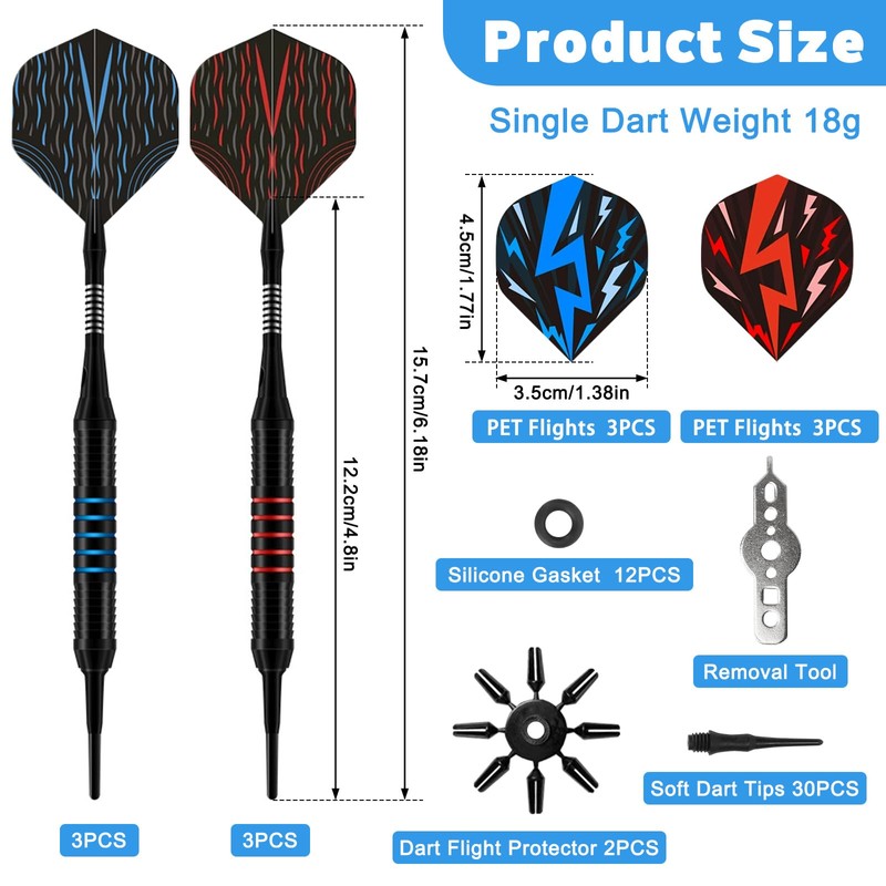 - Package contents: our soft dart set comes with 6 complete dart bodies (with 6 x heads, 6 x barrels, 6 x shafts), 6 elegant dart wings, 6 interchangeable shafts, dart case with locking holes and rubber O-rings to prevent loosening, and you can use it with other steel tips. There are also 30 x premium soft dart tips and 6 x dart wings for you to replace.