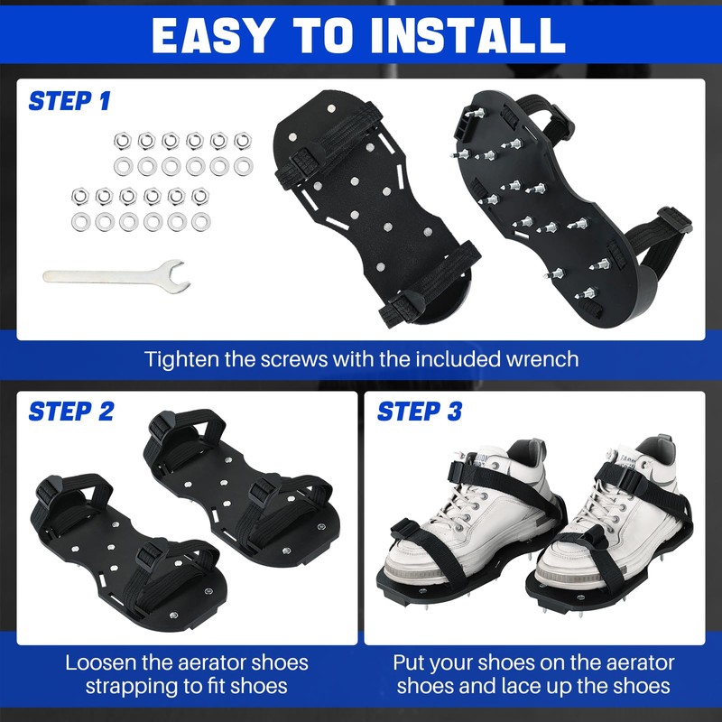 - Easy to Install: Each spiked shoe has 13 heavy duty steel corrosion resistant durable spikes. All you need to do is tighten the screws with the included wrench, lace up the shoes and you're ready to go. You just need a wooden brush handle and you're ready to level it. Then pre-drill a hole in the stem and secure the handle with screws or nails.