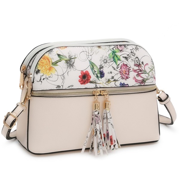 Dasein Women Tassel Zipper Pocket Crossbody Bag Shoulder Purse Fashion Travel Bag with Multi Pockets (White Flower/Beige)