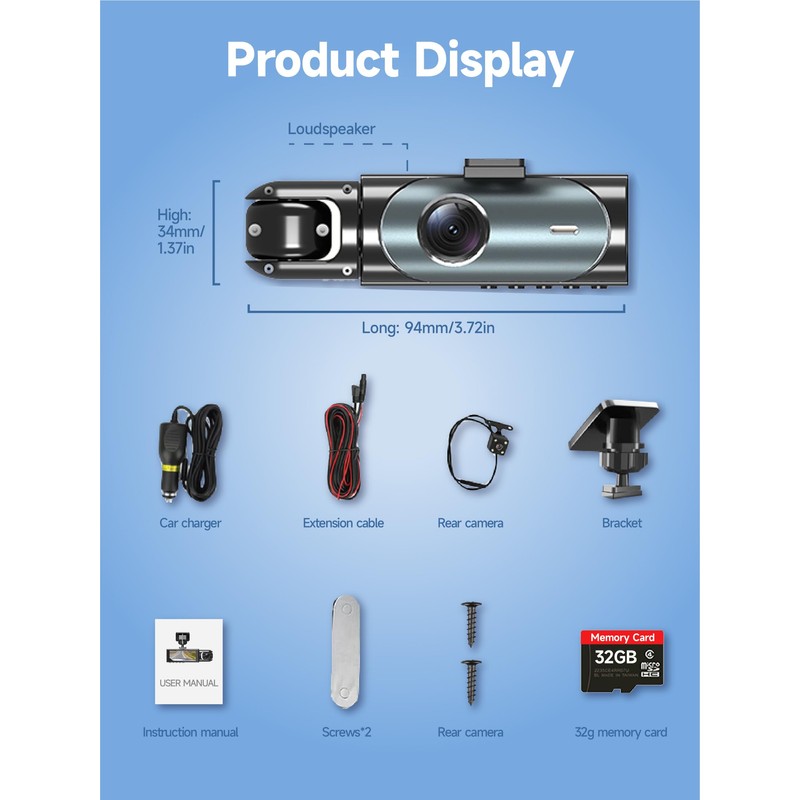 • Dedicated Customer Service: The car dash mount camera comes with a 32GB memory card that does not need to be purchased separately. We offer 1 year maintenance and 24*7 technical support. Questions or technical support for our dashcams for cars, please reach out to us via Amazon message, all message will be answered within 24 hours.