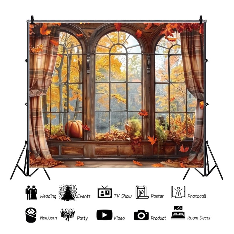 DASHAN 10x8ft Fall Window Photo Backdrop - Maple Leaves Autumn Landscape Photography Backdrop - Season Background Decorations & Photo Props - Fall Autumn Tapestry
