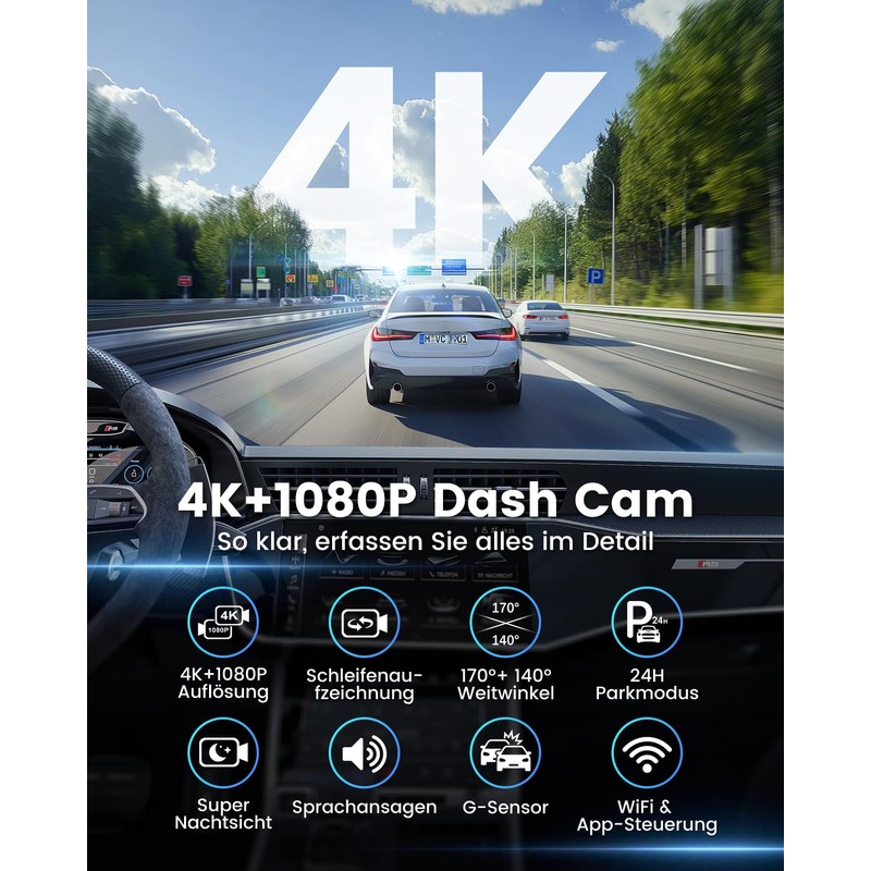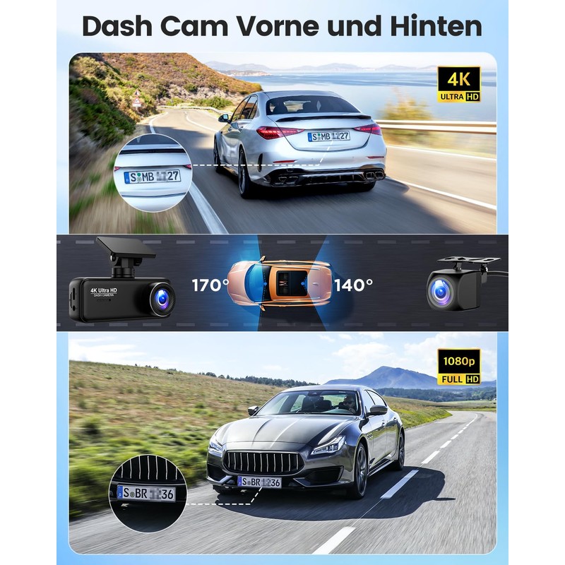 Diese duale kabellose dashcam auto vorne nimmt gleichzeitig mit superhochauflösenden 4K vorne+1080P hinten auf. Selbst bei schwachem Straßenlicht können 4K-Dash-Kameras nachts Details erfassen. Die vordere 170°- und hintere 140°Wifi dashcam auto mit ultraweitem Blickwinkel hilft Ihnen, Verkehrsschilder, Kfz-Kennzeichen und andere wichtige Details mit weniger toten Winkeln zu erkennen.