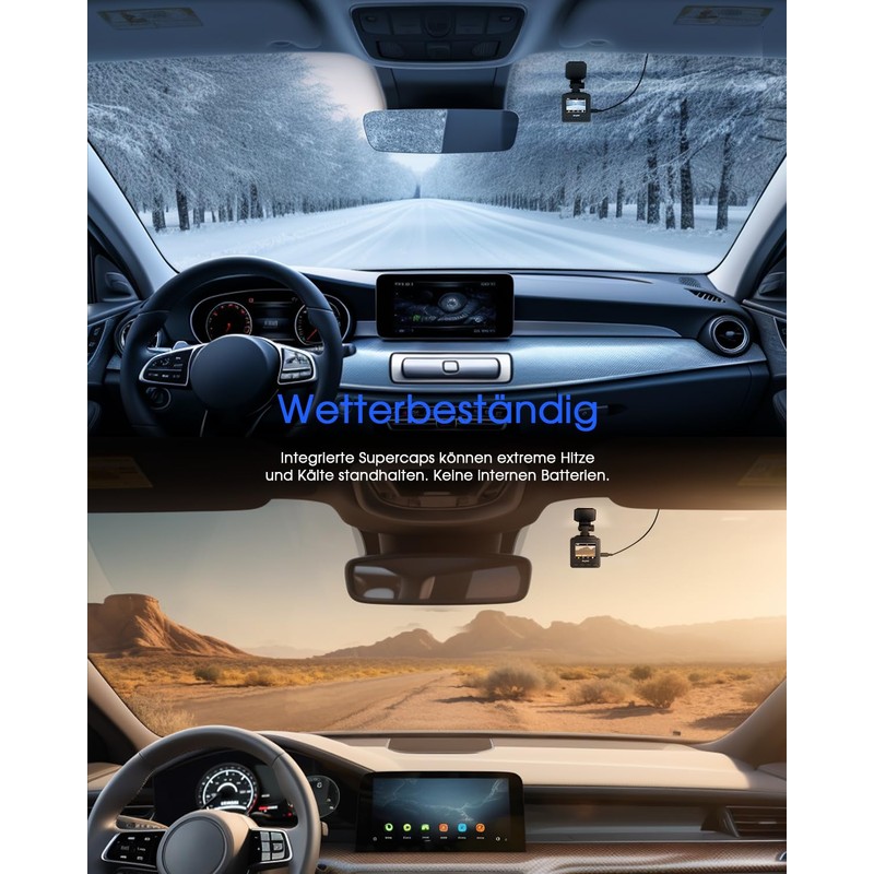 - Extremely heat and cold-resistant super capacitors: super capacitors, which are often found in high-quality dash cams, offer significant advantages over conventional batteries. They charge quickly, store energy efficiently and have a longer service life, extending use by up to 30%. In addition, they feature remarkable tolerance to extreme heat and cold as well as increased stability, making them a safer choice. (Note: without battery power)