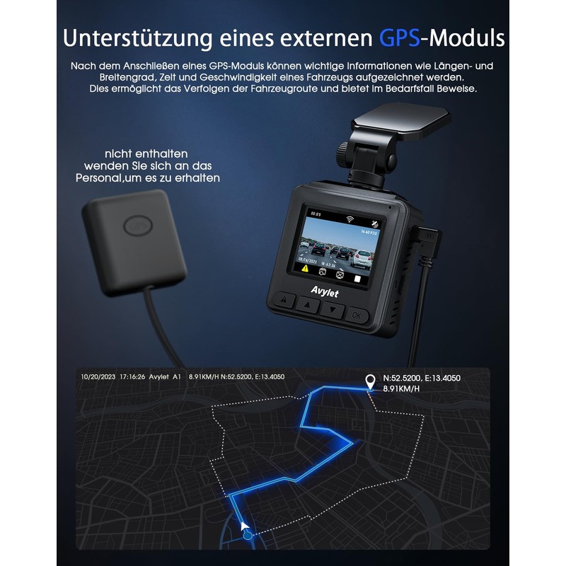 - External GPS module: the support for an optional GPS module allows the dash cam to record your location (longitude and latitude), driving route, speed and time in the videos. This information is easily accessible when you play the videos on a PC and serves as important evidence. (The GPS module is not included, to display GPS data in your videos, contact us to download the required player.)