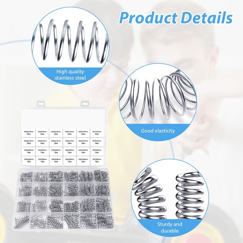 - 420pcs in 24 Sizes This assortment includes 420 compression springs in 24 different lengths and diameters, including 6 different clamping forces. Ideal for hobbyists, repair work, workshops and DIY projects - always the right spring at hand
