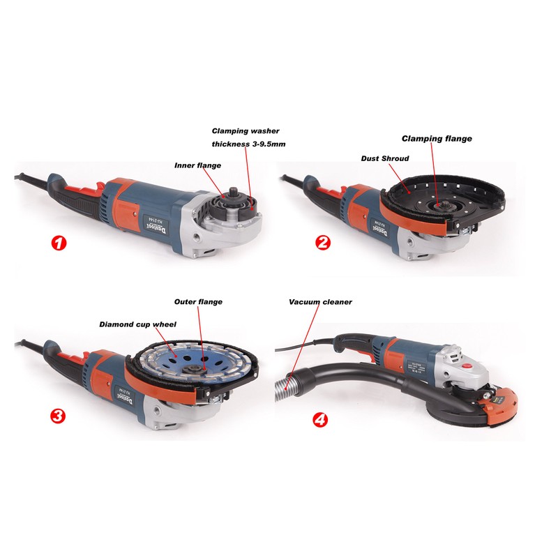 Box Contains the following: 1x Dust Shroud,8PCS clamping washer thickness 3-9.5mm,1x clamping flange, 1x shroud wrench,1x Universal Vacuum Cleaner Hose Adapter,1xUser’s guide. Using this attachment provides improved productivity when efficient dust collection system is used and helps reduce user exposure to harmful silica dust.it is easy to use and wash.And the best choice for 7 inch Double Row Diamond Cup Wheel. ★ This product is not fit a Chicago tools grinder.