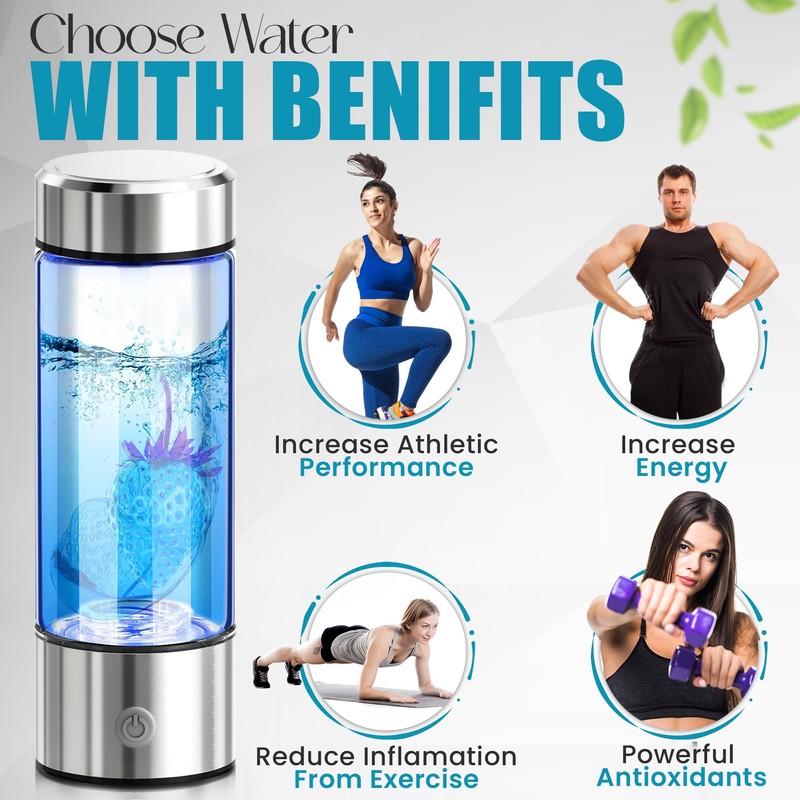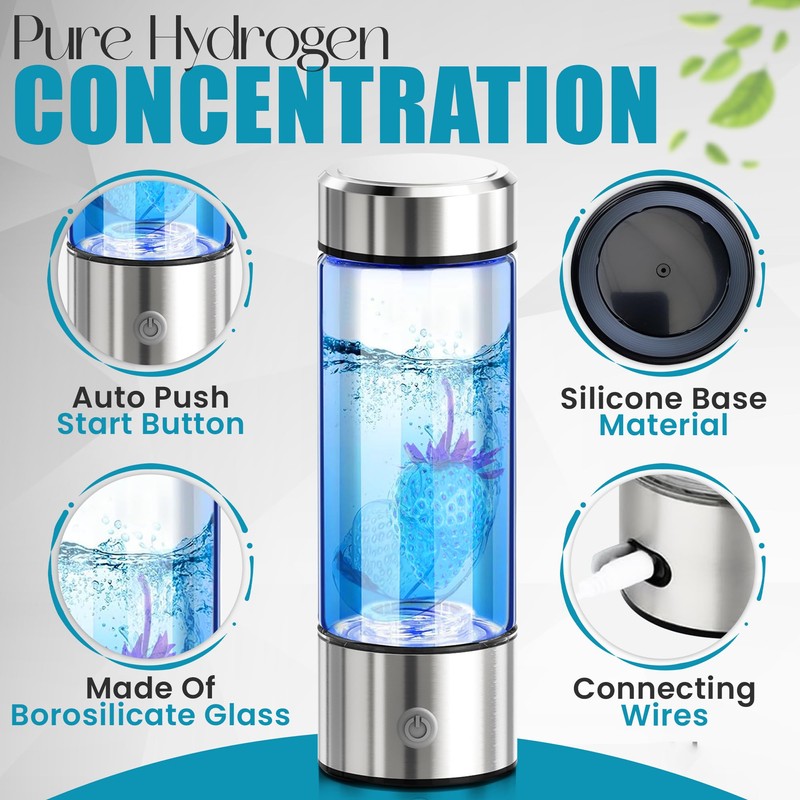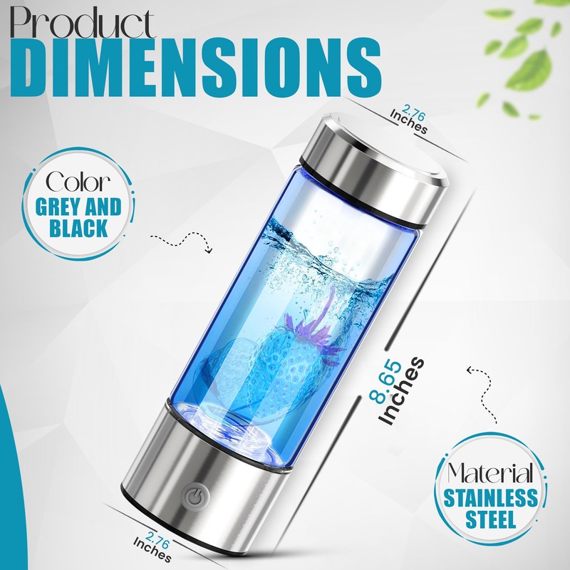 - 【Large Capacity】Portable Hydrogen Water generator The hydrogenated water maker measures 8.26*2.76IN and can hold 420ml of liquid (about 14 ounces). It is portable and can easily meet your daily drinking water when exercising, going out, and working. The hydrogen water bottle glass is made of food-grade borosilicate glass, which does not contain any harmful substances and is safer and can be drunk with confidence.