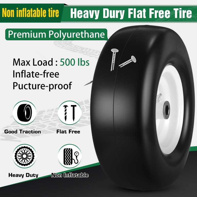 - Reliable Material: constructed from quality polyurethane foam, these push mower wheels tires are weather resistant, wear resistant, and tear resistant; The airless tires are maintenance free and puncture proof, eliminating the need for air pressure checks and inflation; The seamless smooth tread protects your lawn while providing a load capacity similar to pneumatic tires, up to about 400 lbs