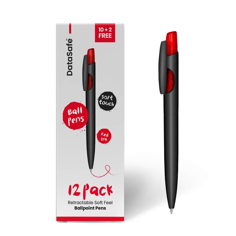 Datasafe Retractable Clicky Ballpoint Writing Pens, Black Casing, Medium Point (1.0 mm) with Soft Touch (12 Count (Pack of 1), Red)