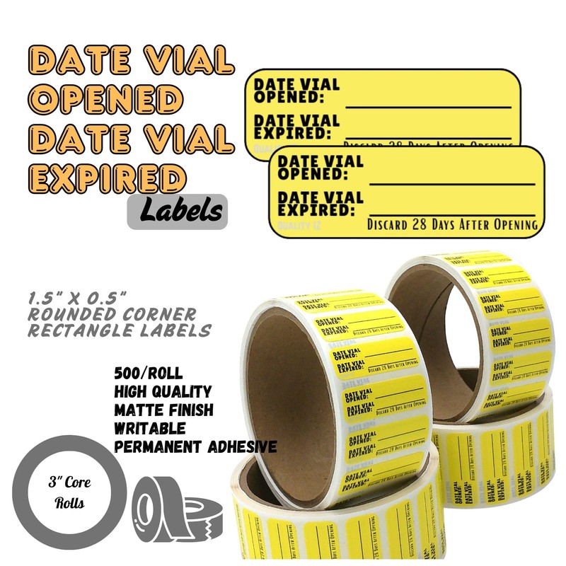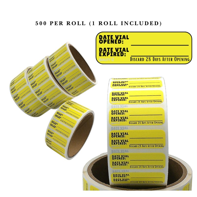Date Vial Opened Date Vial Expired Labels, Yellow 1.5" x 0.5", by Quality IZ (500/roll, 1 Roll)