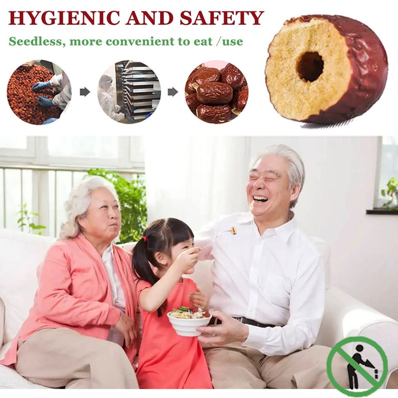 - HYGIENIC & SAFETY :Our jujube red dates organic dates naturally grown and handpicked in the high latitude of china .Machine-dried which not only maintains the aroma and color, but also avoids dust. Pitted dates save the hassle of throwing pits, no wrong swallowing,also friendly to the elderly ,children and pregnant woman !
