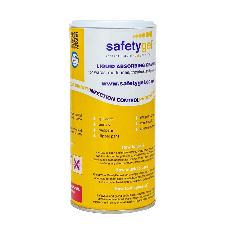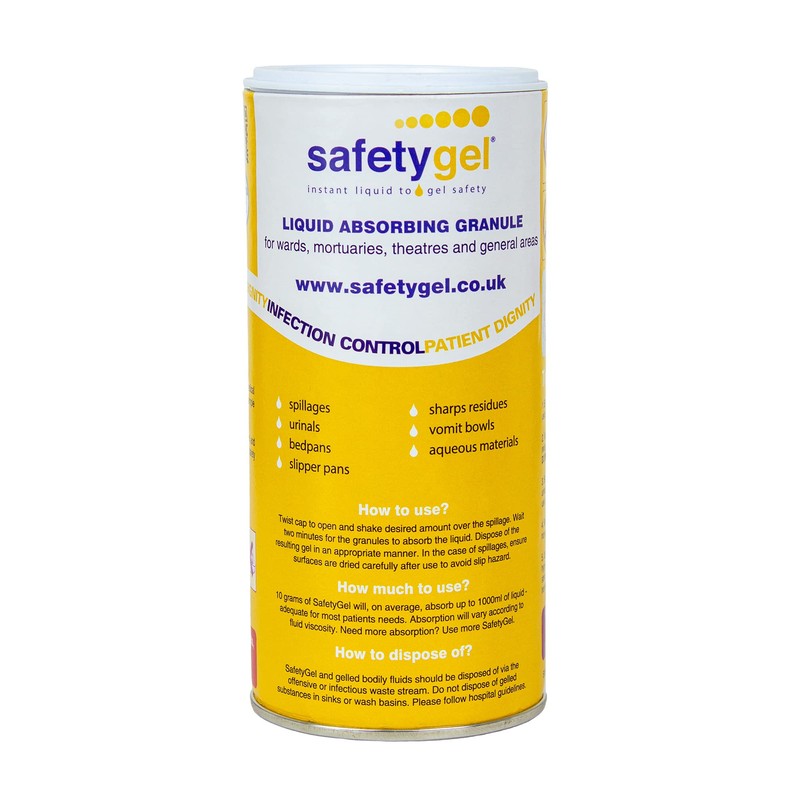 - SafetyGel Shakerpot – 360g Absorbent Granules - Ideal for absorbing large spills of aqueous materials, vomit, blood and mucus. The easy pour shaker pot puts the right quantity of SafetyGel granules into immediate direct contact with the spill or extraneous fluid. Fast absorption of unwanted fluids and spills.