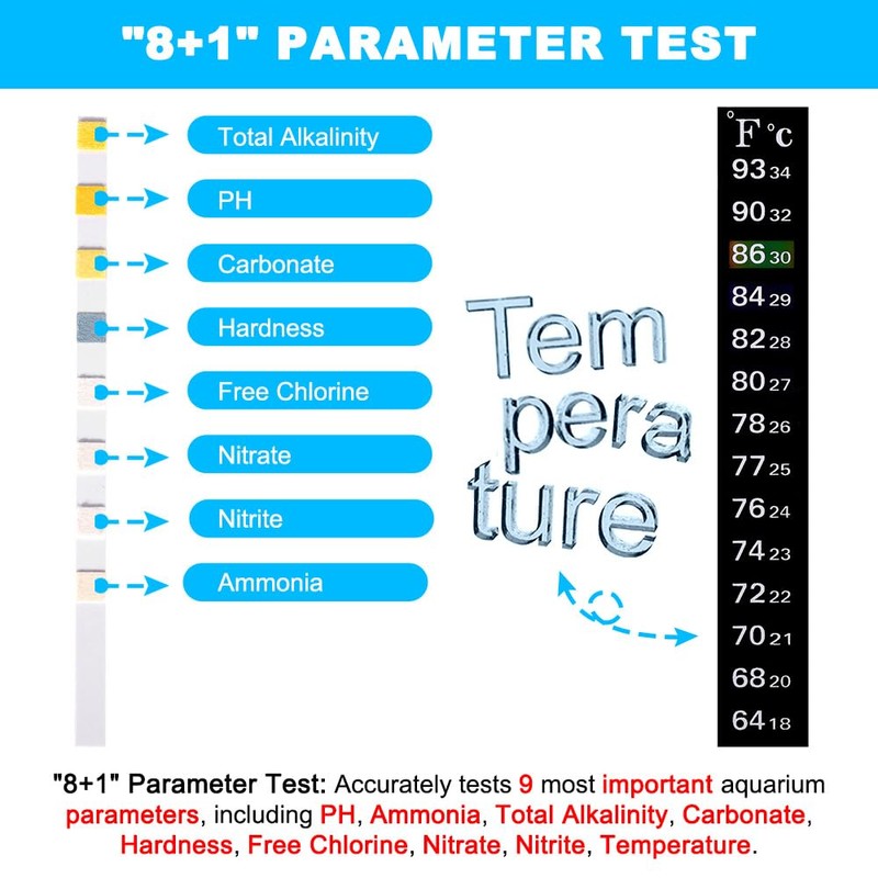 1. "8+1" Parameters Test: Accurately tests 9 most important aquarium parameters, including PH, ammonia, total alkalinity, carbonate, hardness, free chlorine, nitrate, nitrite, temperature.