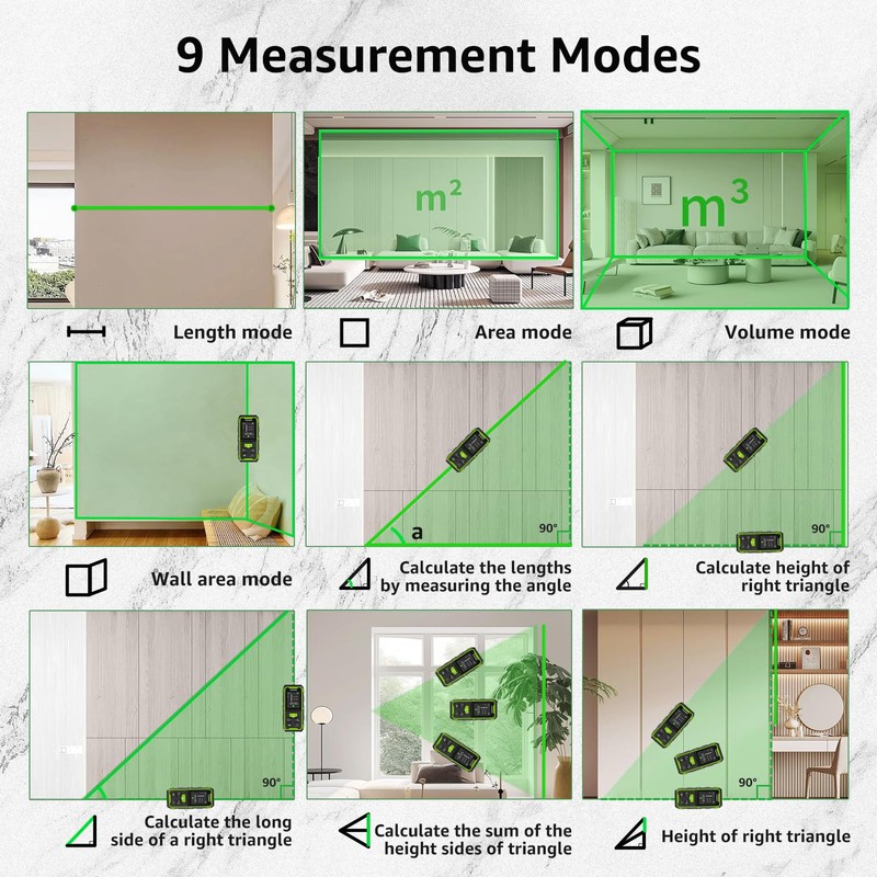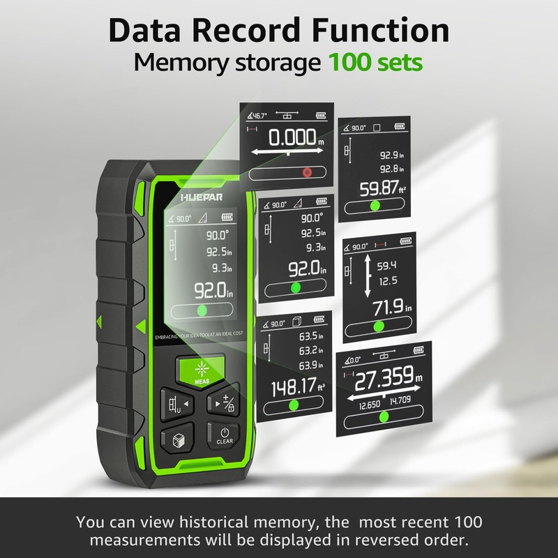 - 【9 Measuring Modes and Additional Measuring Function】The Huepar digital room meter offers 9 measuring modes: length, area, volume, angle, wall area and 4 Pythagorean modes. Switchable M/In/Ft/Ft+In units, 100 data groups can be stored for retrieval, with addition and subtraction mode for effective data calculation, self-calibration mode. You can also easily determine the centre, maximum and minimum value by continuous measurement.