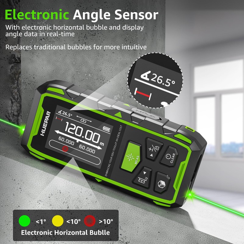 - Digital angle sensor and visualisation of electron bubbles: With the integrated angle sensor, this laser distance meter can measure the angle between the base and the two levels of the device in real time. You can quickly determine the angle and improve measurement accuracy. At the same time, the visualised electronic bubbles in different colours can help you estimate the angle range more intuitively and conveniently. (Red>10°, Yellow<10°, Green<1°)