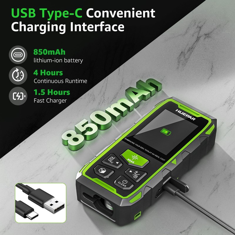 - Laser rangefinder type C rechargeable: Our double-sided laser rangefinder has a built-in 3.7 V lithium-ion battery with 850 mAh. Full charge takes about 1.5 hours and lasts about 5 hours. Each charge can be used for 5500 one-sided measurements and 3500 double-sided measurements. You can carry this distance measuring laser with you all day and charge it at any time with a type C charging cable.