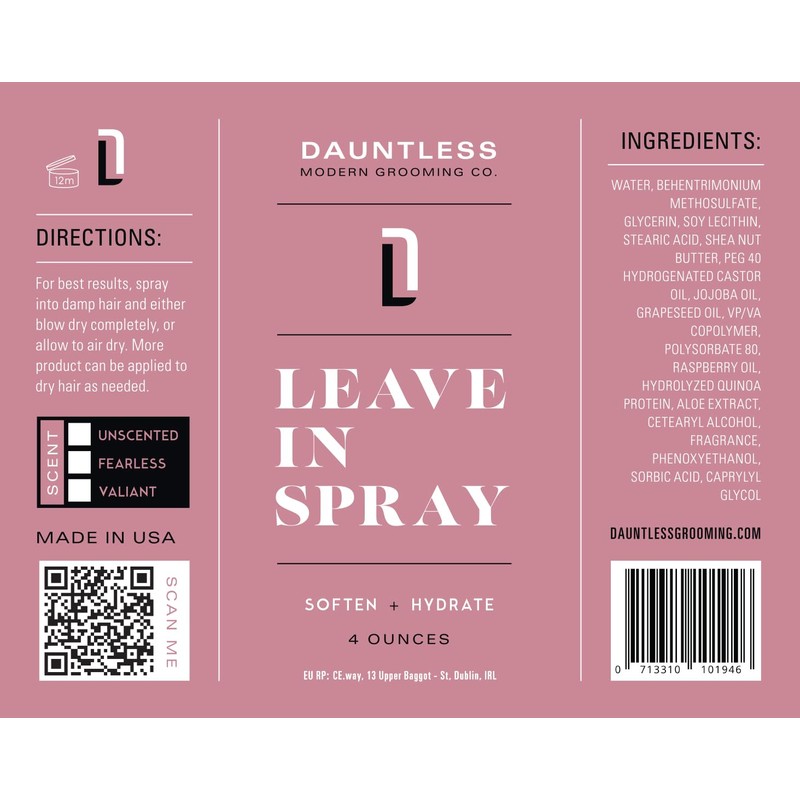 Dauntless Modern Grooming Co | LEAVE IN SPRAY | Hydrate, Soften, Eliminate Frizz | Valiant Fragrance | 4 ounces, Pink