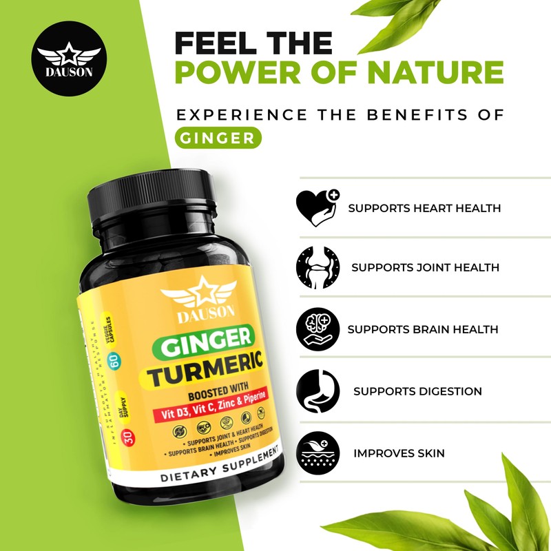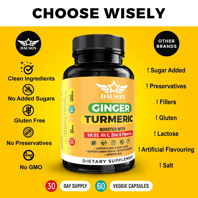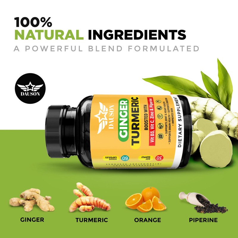 DAUSON Ginger Turmeric Supplements – Boosted with Piperine, Vitamin D3, Vitamin C, Zinc & Orange | Joint, Gut & Skin Health Support | 60 Capsules | Ayurvedic