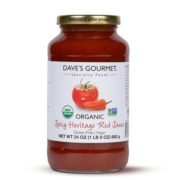 Dave's Gourmet Organic Spicy Heritage Red Pasta Sauce - Zesty & Rich Tomato Chili Blend - Marinara Sauce - Ideal for Pasta, Pizza, Sausage & More - Vegan & Gluten Free - 24oz Jar (Pack of 1)
