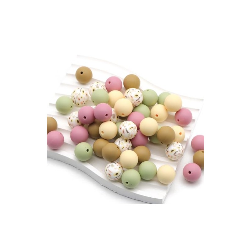 - 50 Pieces Silicone Beads: Total 50 piece 5kind of color,10 pcs per color round silicone beads (four color solid color round silicone beads,one flower pattern round silicone beads)