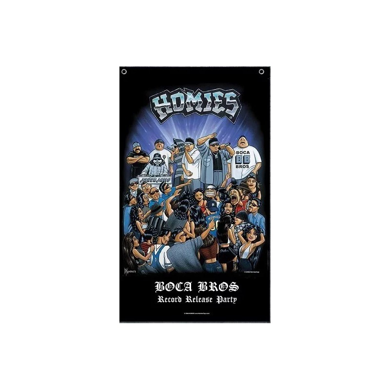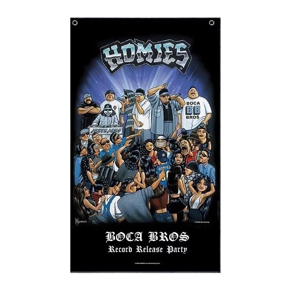 David Gonzales Art Chicano Homies Release Record Party Banner.This Polyester banner has 2 metal grommets. Banner High Quality dye-sublimated Design. Printed on one side all the way through the fabric. Double-stitched around all edges with 4 rows of stitching on fly edge. Size is 3 feet by 5 feet New in sealed packaging. Shipped with USPS First Class Package.