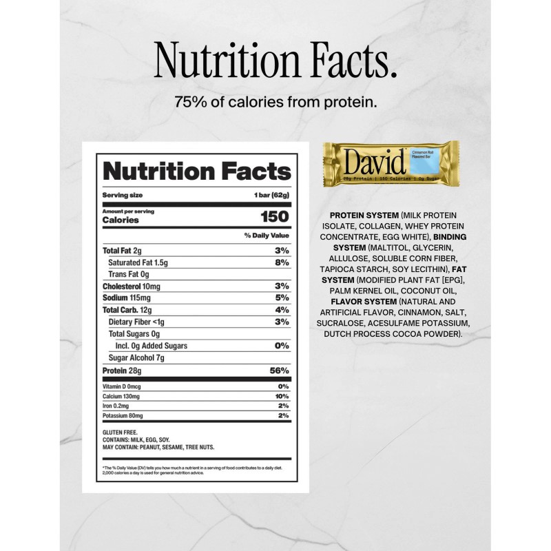 David Protein Bars Cinnamon Roll Flavor 28g of Protein 150 Calories -Pack of 12
