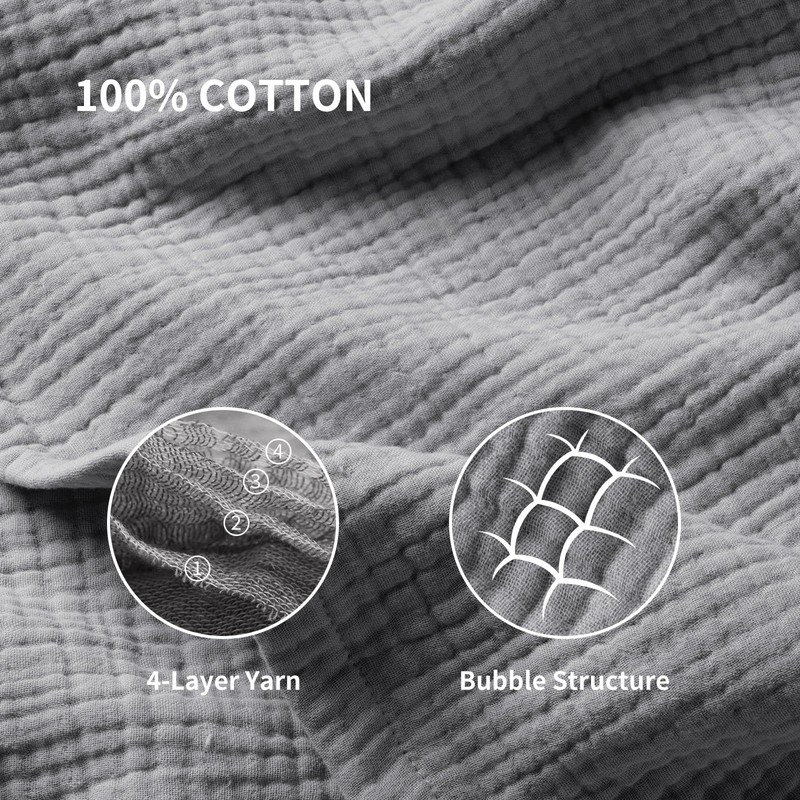 - 100% Cotton Muslin Blanket: This is crafted from 100% cotton, its natural and breathable features ensures its ultra gentle touch, which makes it highly skin-friendly, ideal for sensitive individuals who seek comfort and safety in their daily lives. It's like a tender embrace, making every moment spent with the blanket a truly cozy and pleasant experience. The lightweight and smooth texture, providing you with all season comfort whether you're snuggled up in bed or relaxing on the couch.