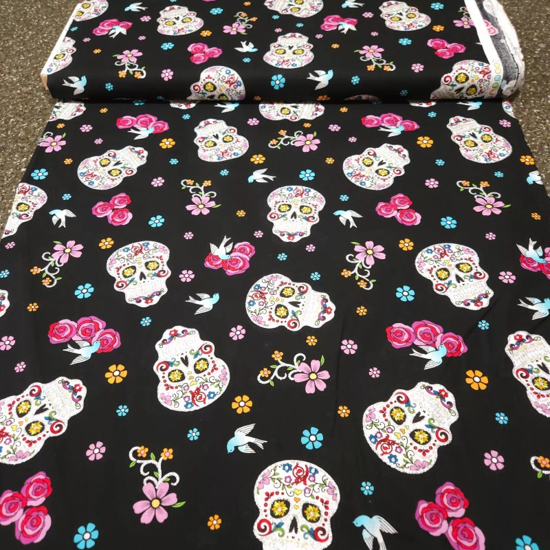 Day of the Dead with Silver Glitter by David Textiles. 100% cotton, Quilt Shop Quality, new, approximately 43" wide, on the bolt. Being sold by the yard.