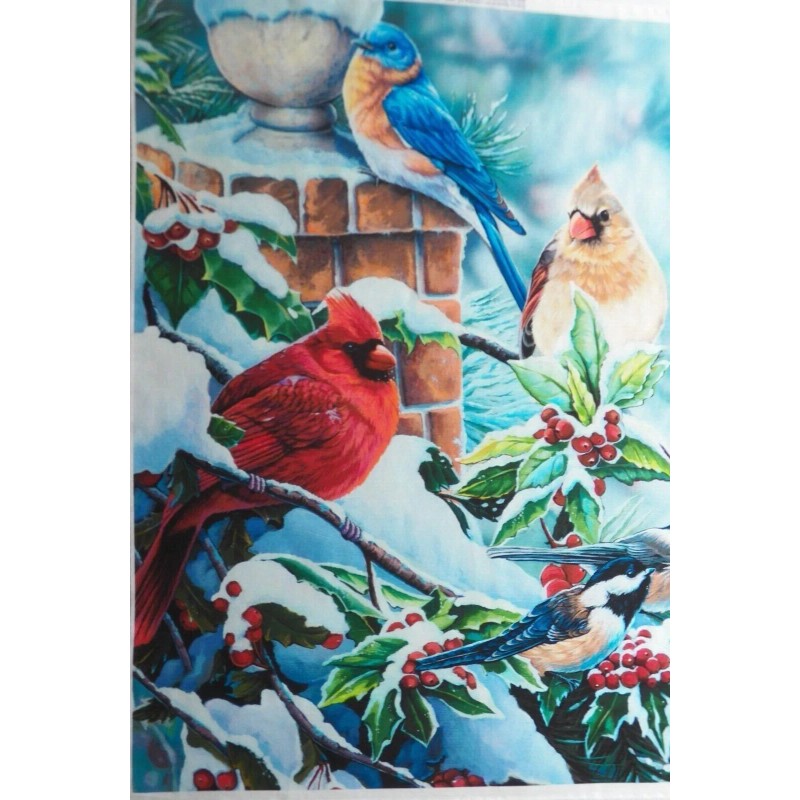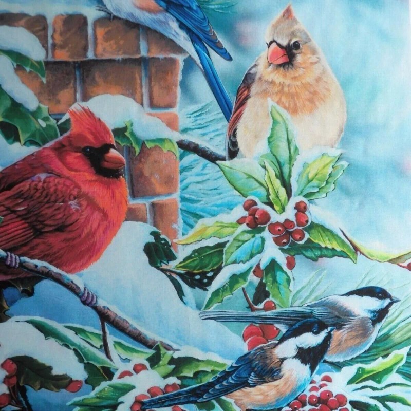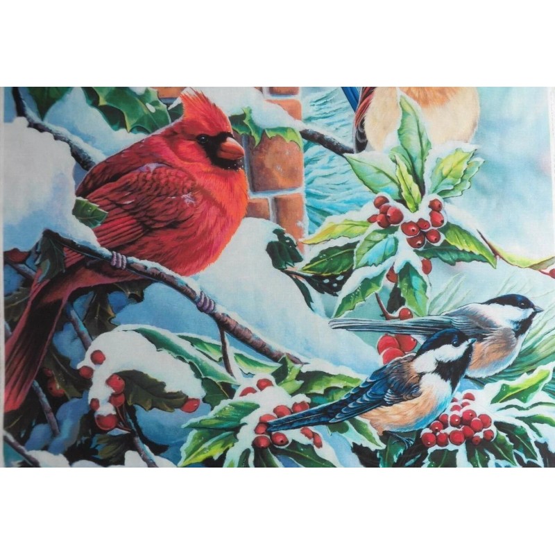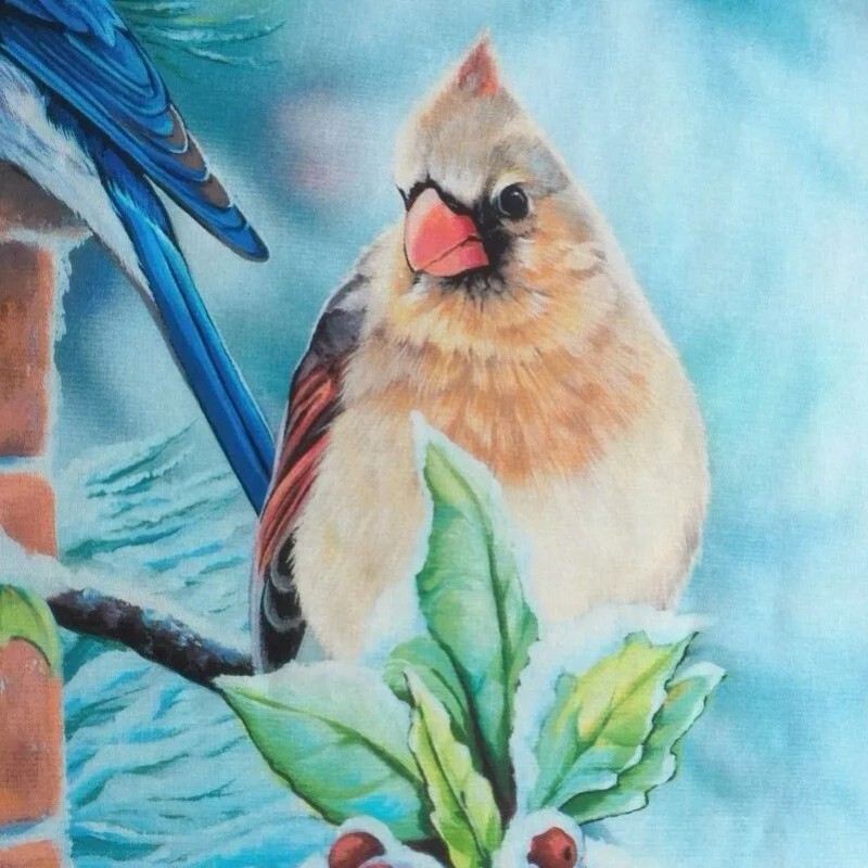 David Textiles Fabric Panel of Birds perched in a Snow-Covered Holly Bush, Jenny Newland for DT