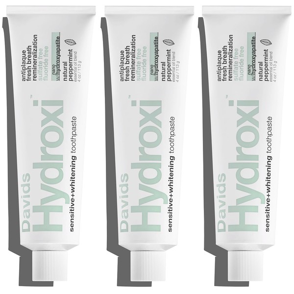 Davids Hydroxi Fluoride Free Nano Hydroxyapatite Toothpaste for Remineralizing Enamel & Sensitive Relief, Whitening, Antiplaque, SLS Free, Natural Peppermint, 4oz, Made in USA (3 Pack)