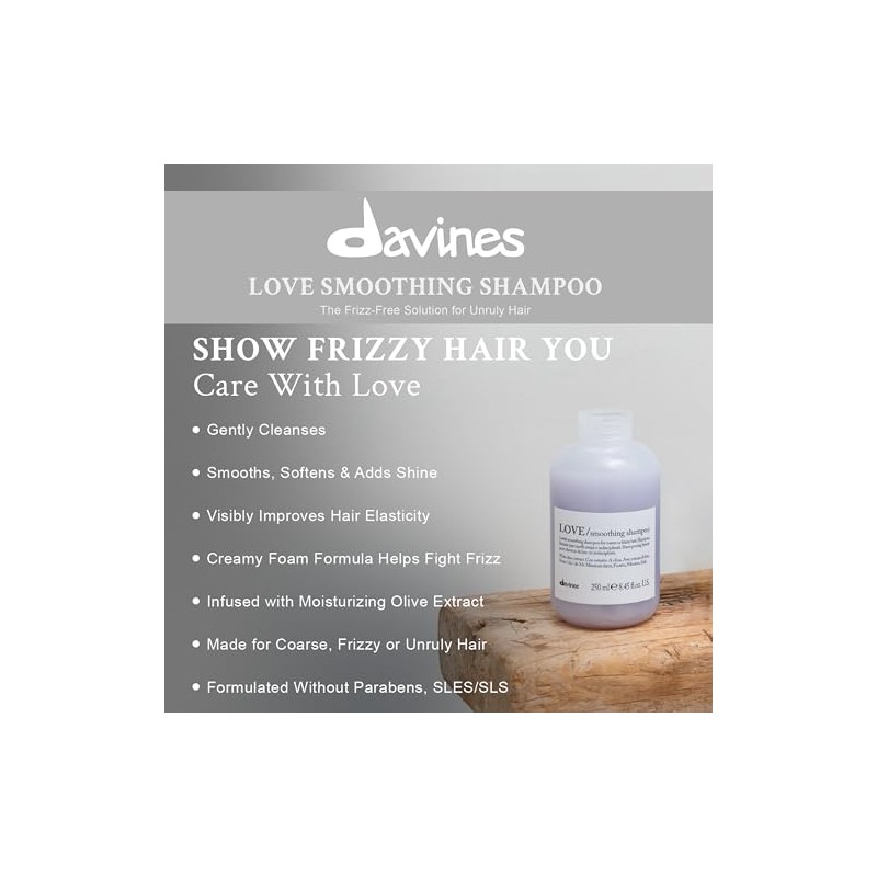 Product Description Shampoo for frizzy or unruly hair for a smooth look. Formula characterized by a soft and creamy foam designed to gently cleanse frizzy hair, making it smooth. Brand Story Davines is an international beauty dedicated to a balance of beauty and sustainability. All products are care-crafted in Parma, Italy using the highest-quality natural ingredients and scientific rigor.