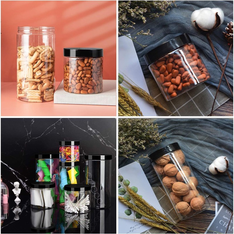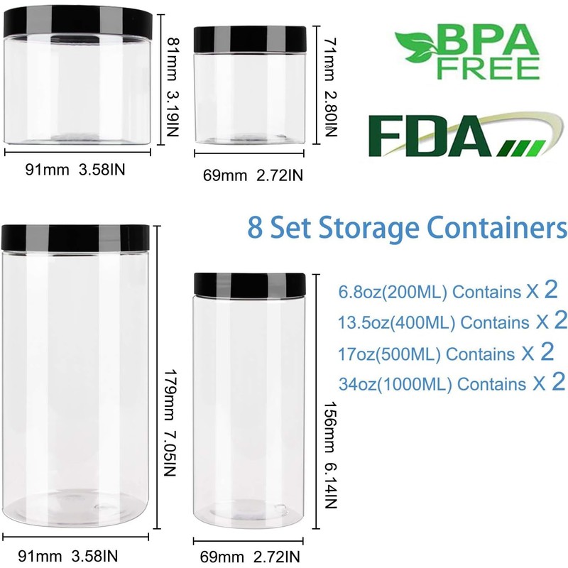 - 8 storage boxes for kitchen: the pack contains 8 transparent storage boxes with black lids. 2 mini containers (7 oz / 0.2 l), 2 small containers (14 oz / 0.4 l), 2 medium containers (17.6 oz / 0.5 l), 2 large containers (35.2 oz / 1 litre). Comes with reusable labels and white marker.