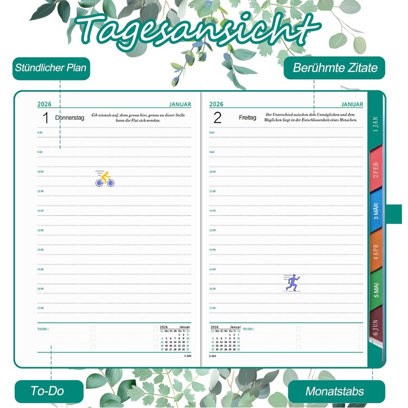 • 2026 A5 Day Calendar - From January to December: Every day is well organised - 1 working day per page (Saturday/Sunday half a page each). So there is enough space for all appointments and to-dos. With 2 ribbon markers and practical pen loop