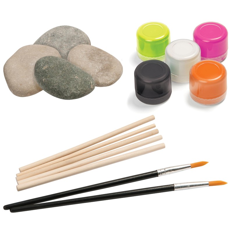 - THIS KIT CONTAINS: 4 large, porous rocks, 3 neon paints, plus black and white paints, 2 high-quality paint brushes, 5 dotting tools in various thicknesses, A 48-page book.