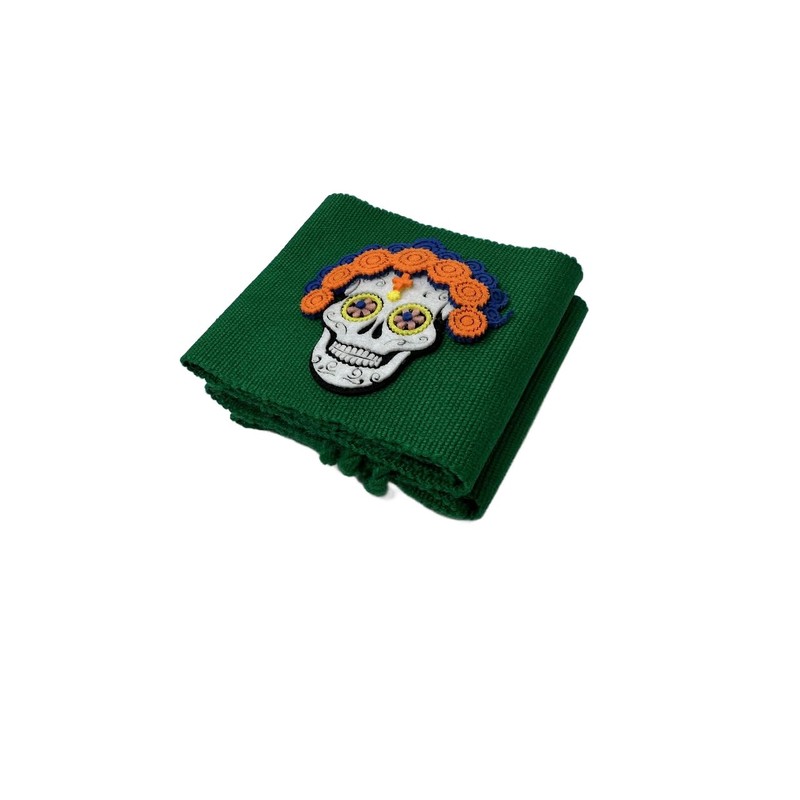 Day of the Dead Sugar Skull Belt, Green Canvas with Floral Crown Design, Mexican Folk Art Style