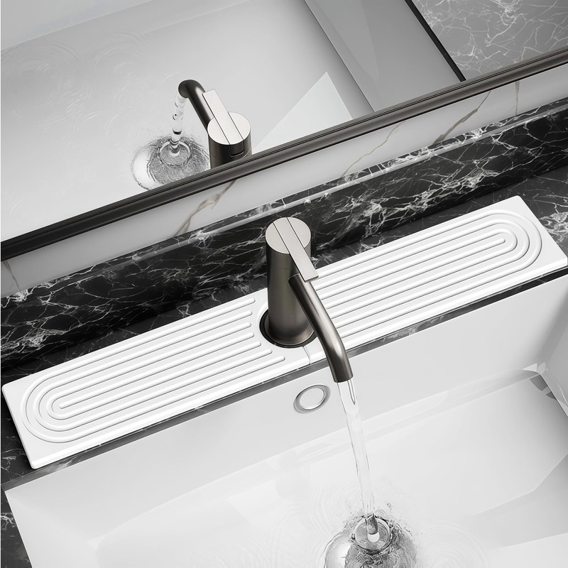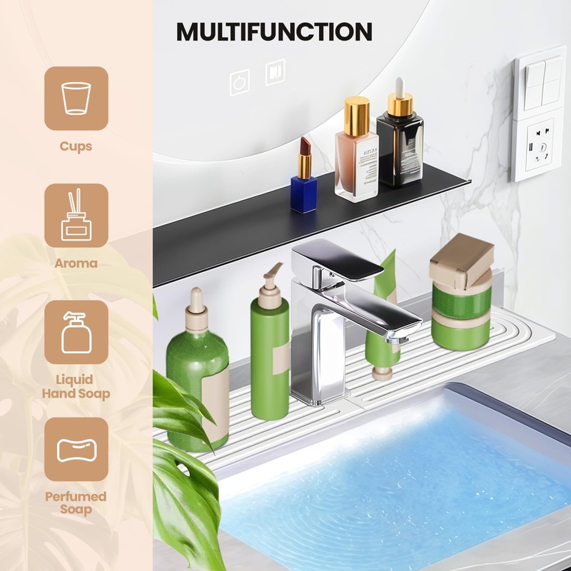 - NO MORE MESSY COUNTERTOP:This Quick Drying Splash Guard for sink is not only a drying mat, but also a organizing mat for soaps, cups, soap bottle, dish sponge, lotions, and anywhere you need to absorb water quickly, keeping your countertops more dry & tidy.