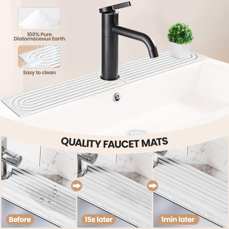 - FAST-DRYING:Made of natural diatomite, this stone faucet mat absorbs moisture instantly with deep grooves for rapid evaporation. No more water buildup – keeps surfaces dry and clean in seconds.