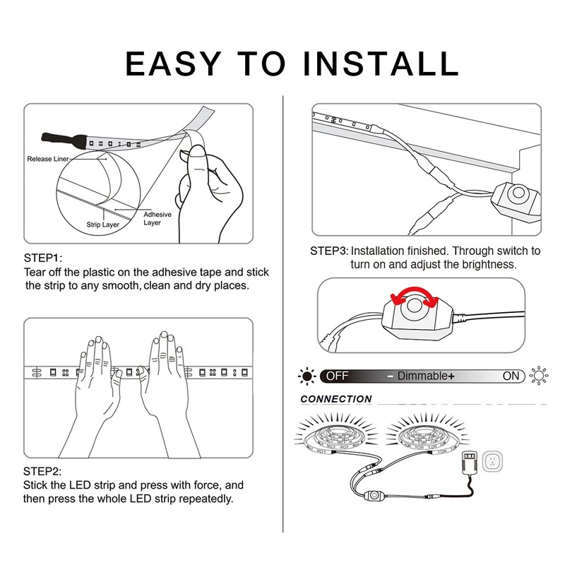 - Simple installation: The installation of the strip lights is very simple, before the installation, please keep the surface dry and clean
