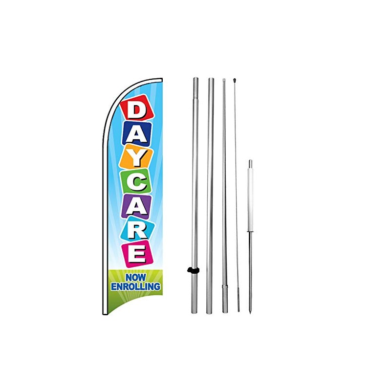 4 Less Co, DAYCARE NOW ENROLLING Windless Feather Swooper Flag Kit. Complete kit: 11.5 Ft Tall flag Aluminum pole, approx 15ft Ground spike Windless flag doesn't need wind to fly fully.